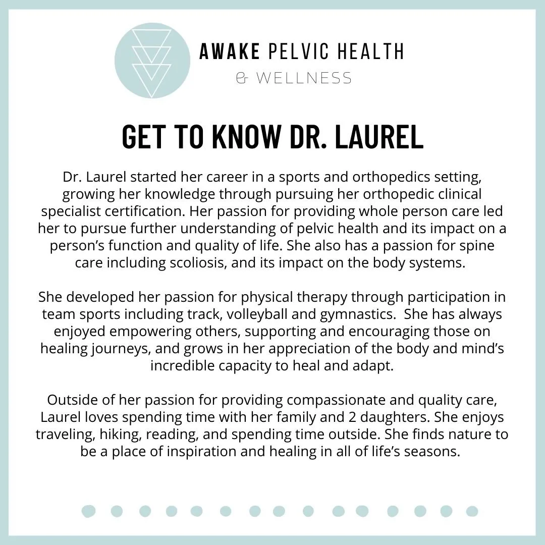 We are so excited to welcome Dr. Laurel Welch, PT, DPT and Orthopedic Certified Specialist to our team at Awake Pelvic Health & Wellness. Dr. Laurel comes to us with a great depth of experience in the pelvic health and orthopedic world. Learn more about Dr. Laurel below!